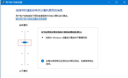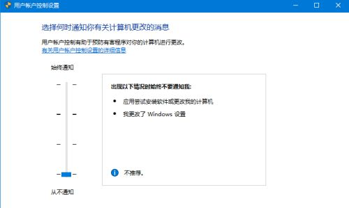 3. 打开用户账户控制设置后,滑动条可以调节安全等级,总是出现窗口就是因为安全等级过高导致的。